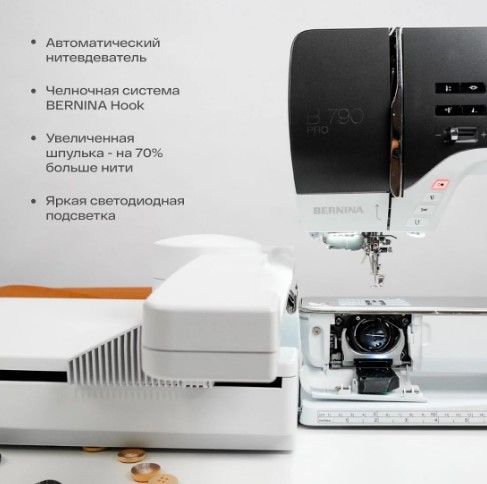Швейно-вышивальная машина BERNINA 790 PRO — идеальный выбор для тех, кто стремится к совершенству и профессионализму в шитье, квилтинге и вышивании, сочетая передовые технологии с высочайшим уровнем комфорта и точности.