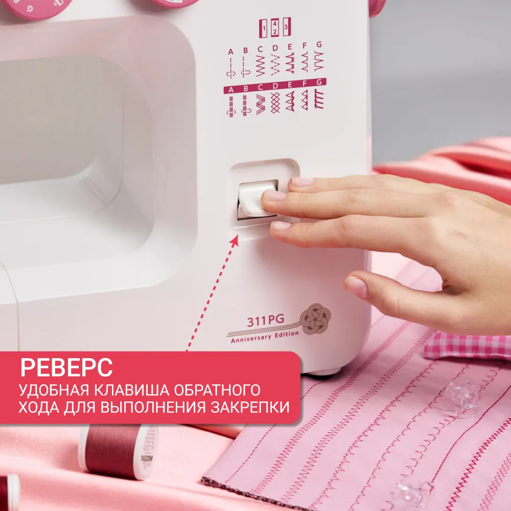 Встречайте новинку, электромеханическую швейную машину Janome 311PG Anniversary Edition выпущенную к 100-летнему юбилею компании Janome. На юбилейном дизайне изображён золотой «мидзухики» (узелок на счастье), декоративного шнура, который обвязывается вокруг подарка или конверта. Janome 311PG Anniversary Edition лёгкая в управлении электромеханическая швейная машина, которая подойдёт для любых домашних работ. Данная модель оснащена вертикальным челноком, без проблем шьёт любые виды тканей и выполняет все необходимые швейные операции: зигзаг, эластичный зигзаг, потайные, трикотажные, оверлочные строчки, строчку-мережку. Для выполнения петли в полуавтоматическом режиме в комплектацию этой модели входит рамка для петель. Съёмный рукав позволяет обрабатывать узкие детали, манжеты, детские вещи, а с помощью клавиши реверс можно штопать и делать закрепку в конце строчки. Janome 311PG Anniversary Edition подойдёт для тех, кто ищет надёжную помощницу для освоения мира шитья.