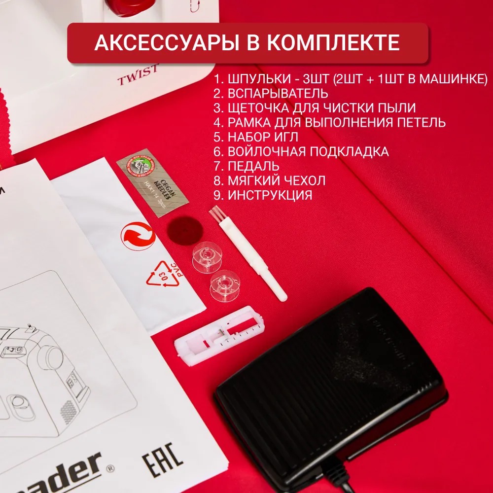 Иглы, шпульки, распарыватель, щеточка для очистки, фетровая прокладка, инструкция на русском языке, чехол (мягкий), педаль