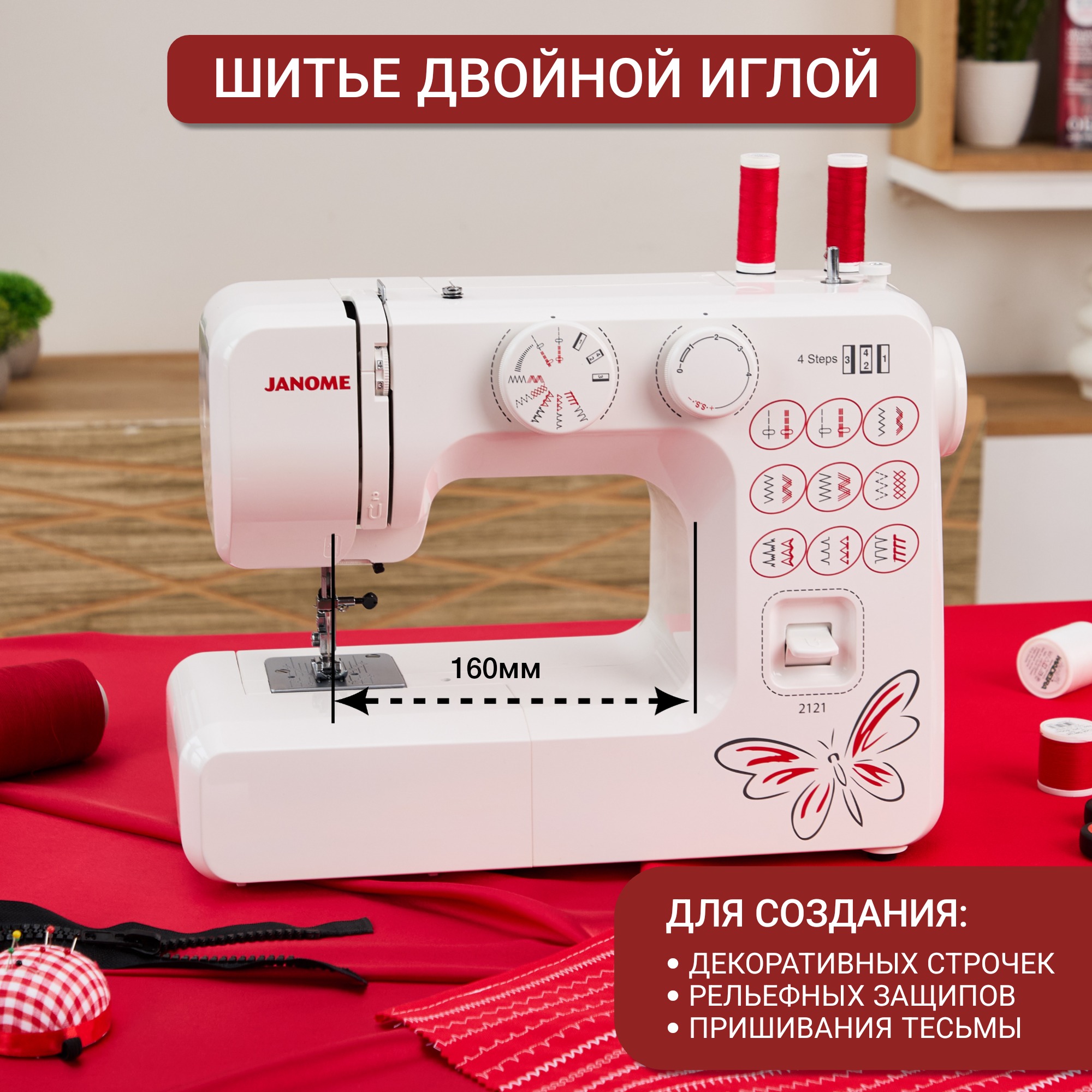 Электромеханическая швейная машина Janome 2121 - отличное решение для помощи в домашнем шитье. Простая модель с вертикальным челноком и удобными регулировками.
