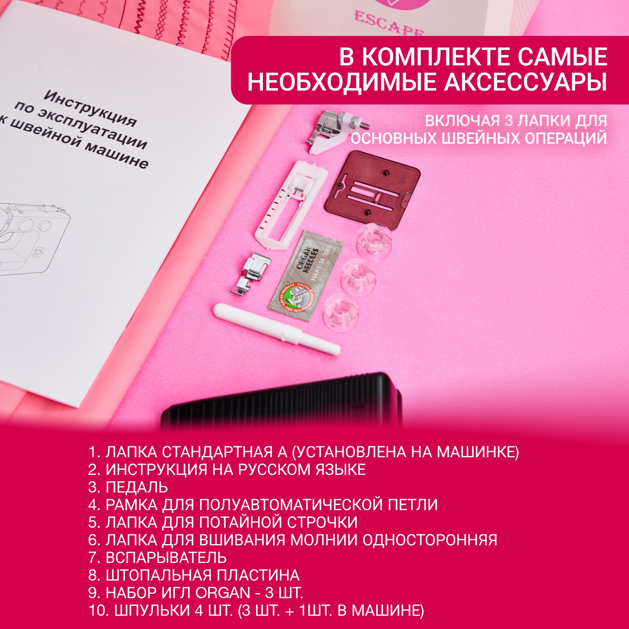Стильный дизайн, проста и легкость управления выделяет швейную машину Janome V-12 Escape из остального ряда швейных машин Janome. Машина замечательно справляется с любыми типами тканей. Вертикальный качающийся челнок дает качественную прямую строчку. Janome V-12 имеет петлю-полуавтомат, которая выполняется в четыре приема без поворота ткани с помощью специальной петельной лапки. Благодаря краеобметочным (оверлочным) операциям, Вы без проблем сможете обработать край изделия, чтобы он не "сыпался", а с помощью потайных строчек - легко и быстро подшить низ изделия.