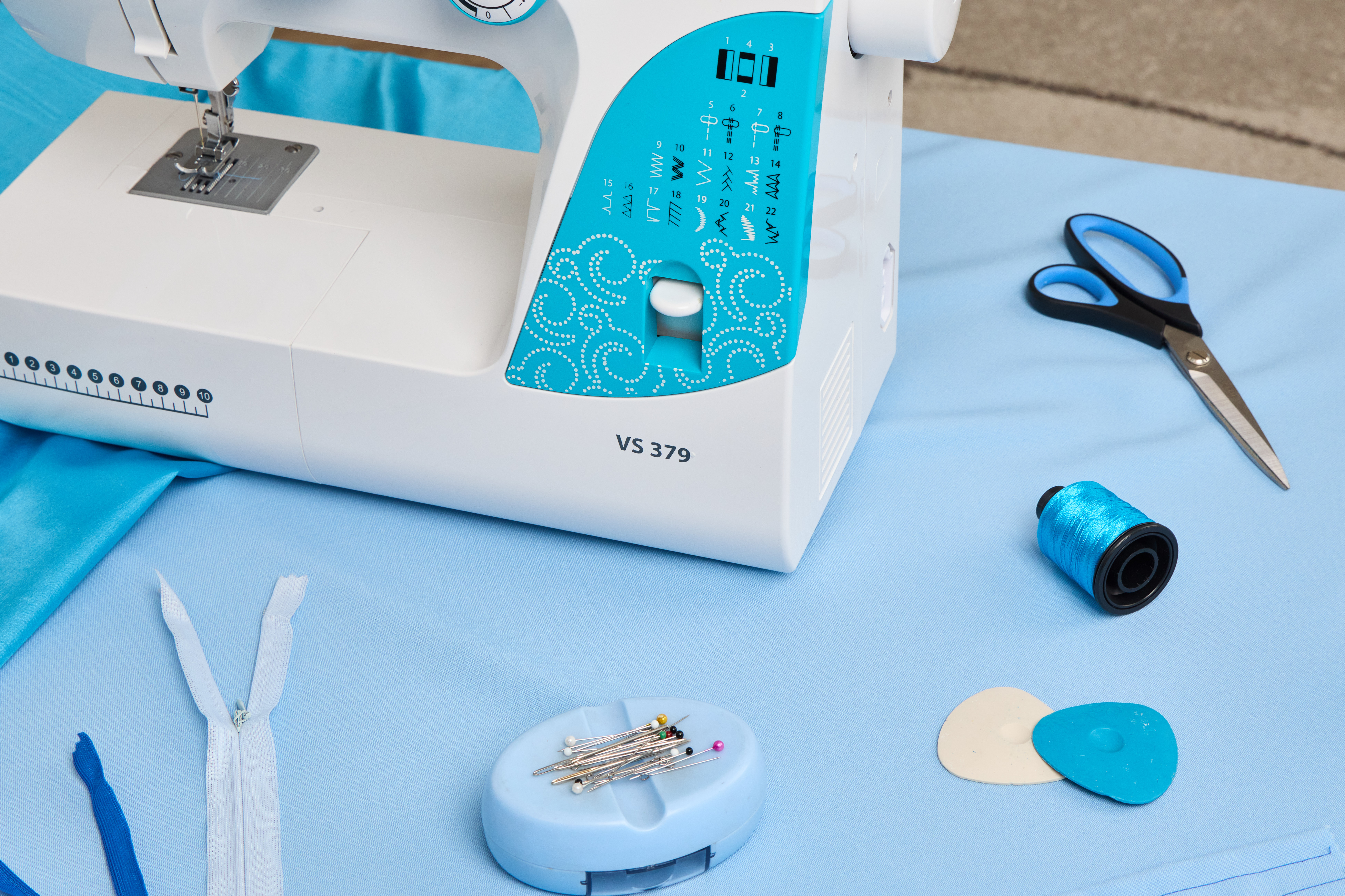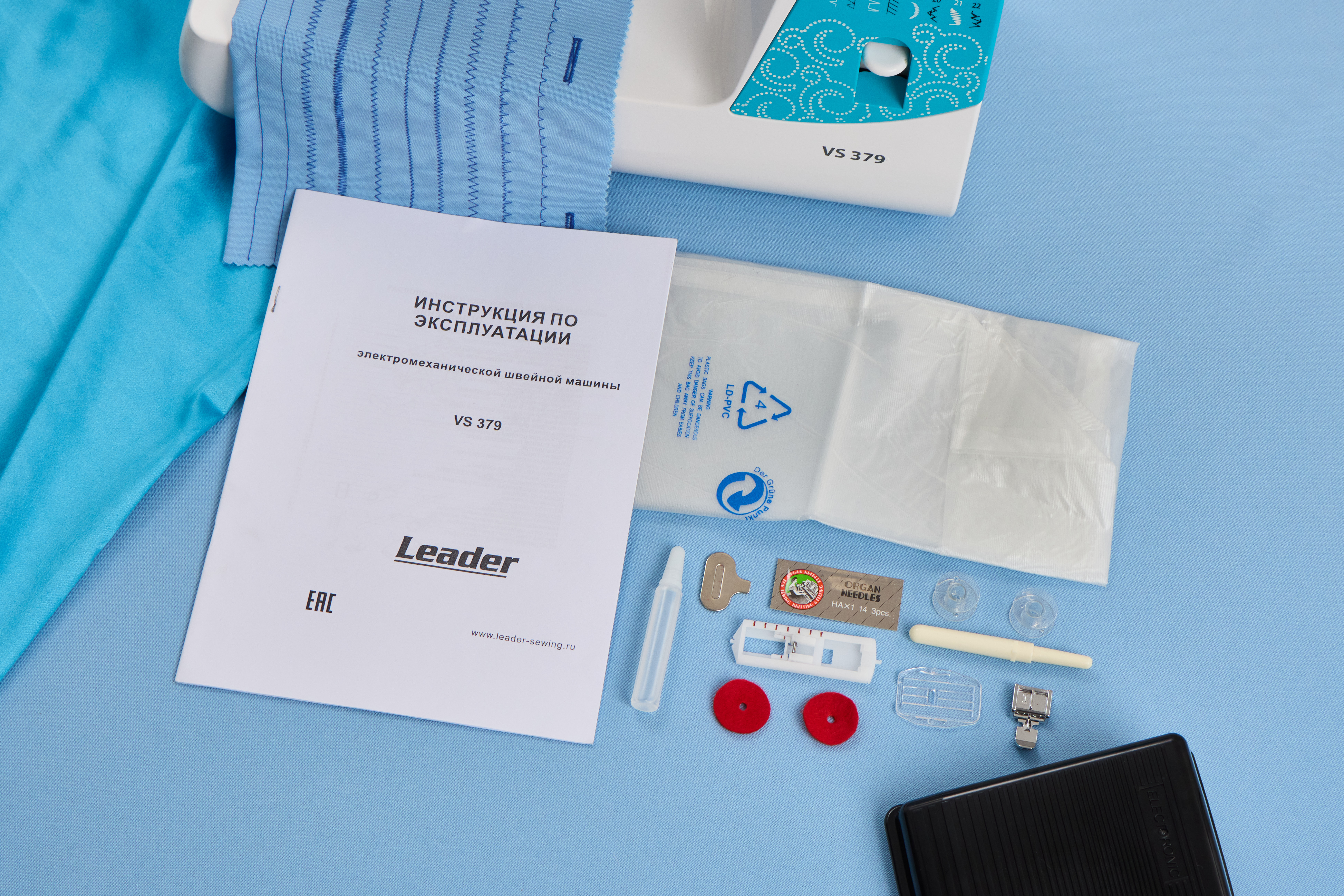 Leader VS 379 станет вашей помощницей в быту. В её стандартную комплектацию кроме лапки для прямой строчки входят рамка для создания петли, лапка зигзаг и лапка для втачивания молнии. В комплекте идут удобный вспарыватель, набор игл, дополнительные шпульки. Комплектация хранится в отсеке съёмного столика. Ещё одно преимущество - на съёмном столике нанесена линейная разметка, при необходимости всегда можно замерить интересующий размер в изделии.