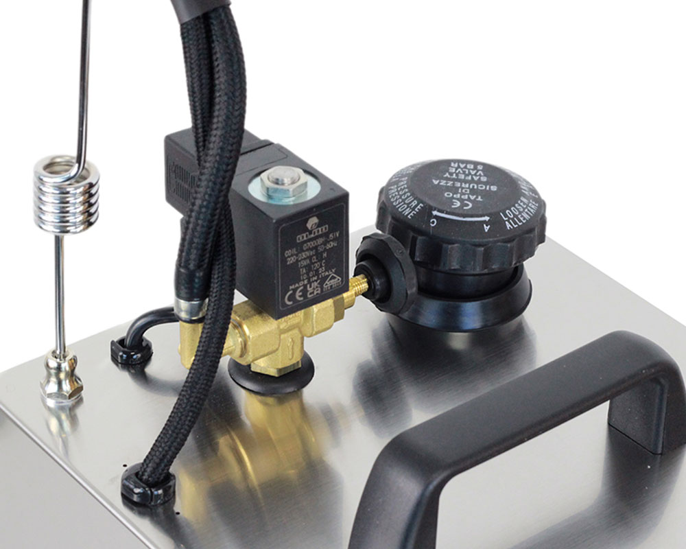 Объем бойлера 5 литров. Максимальное количество заливаемой воды 3,7 литра, что обеспечивает подачу мощного и сухого пара до 4,5 ч.