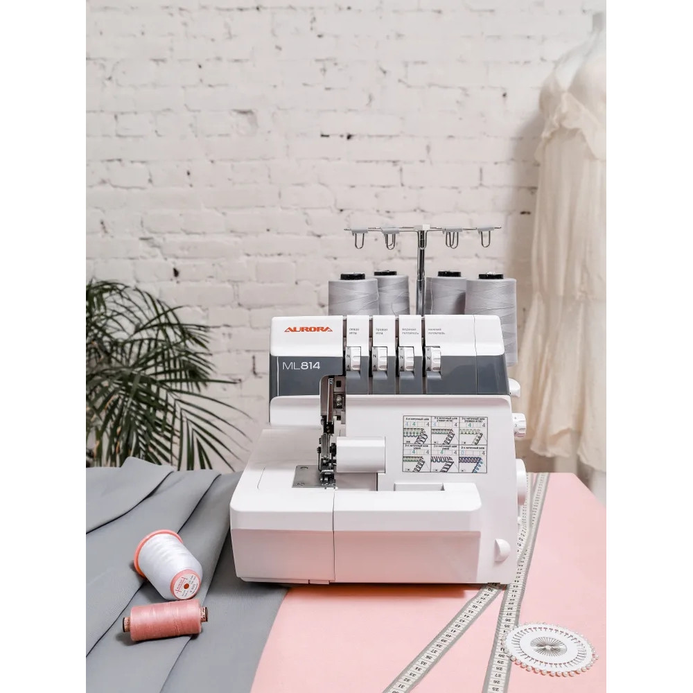 Aurora 814 производит 9 швейных операций, в частности, цепные стежки с максимальной скоростью до 1200 ст./мин. Отличительные черты данной модели – наличие ручки для переноски и мягкого чехла. Лампа, предусмотренная в оверлоке, потребляет 15 Вт, а общая потребляемая мощность техники составляет 120 Вт.